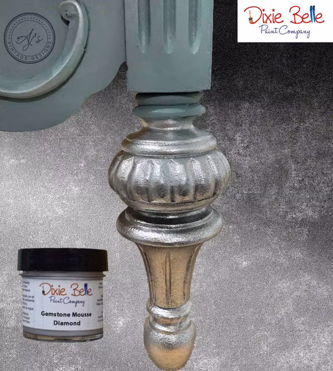 Dixie Belle Gemstone Mousse är en krämig och högt pigmenterad metallisk färg/mousse som används till för förgyllning av detaljer (tjockare och mer koncentrerad än vanlig än metallfärg).