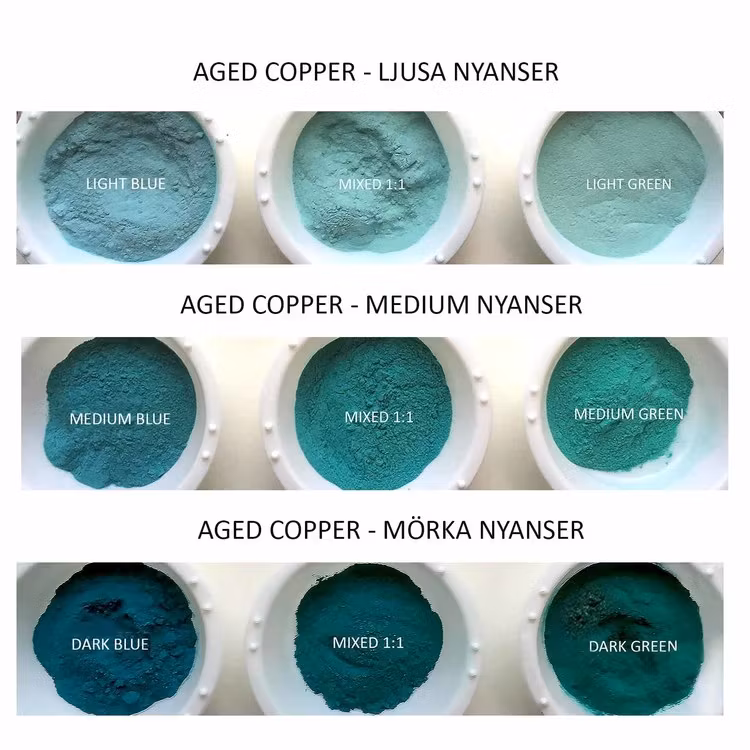 Aged Copper finns i två serier, en med grön ton och en med blå (turkos) ton. I båda serierna finns en ljus, en medium och en mörk nyans. Pulvren kan användas separat eller tillsammans beroende på önskad nyans och styrka. De kan också blandas med varandra för nya nyanser. Den mörkaste nyanserna ser inte ut som ärgad koppar på egen hand, men de är ett färgstarkt komplement till dig som gillar djup och dramatiska effekter.