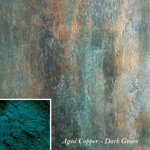 Aged Copper utgörs av både syntetiska och naturliga mineralpigment. Anledningen till att vi valt att använder syntetiska pigment i Aged Copper är att de naturliga pigmenten i dessa attraktiva nyanser är klassificerade som hälsoskadliga vid inhalation. Aged Copper kan användas utomhus, men syntetiska pigment är mer känsliga för UV-strålning och ytan bör skyddas med ett lack innehållande UV- filter. För utomhusbruk behöver produkten du fäster pigmentpulvret med också klara utomhusklimat.