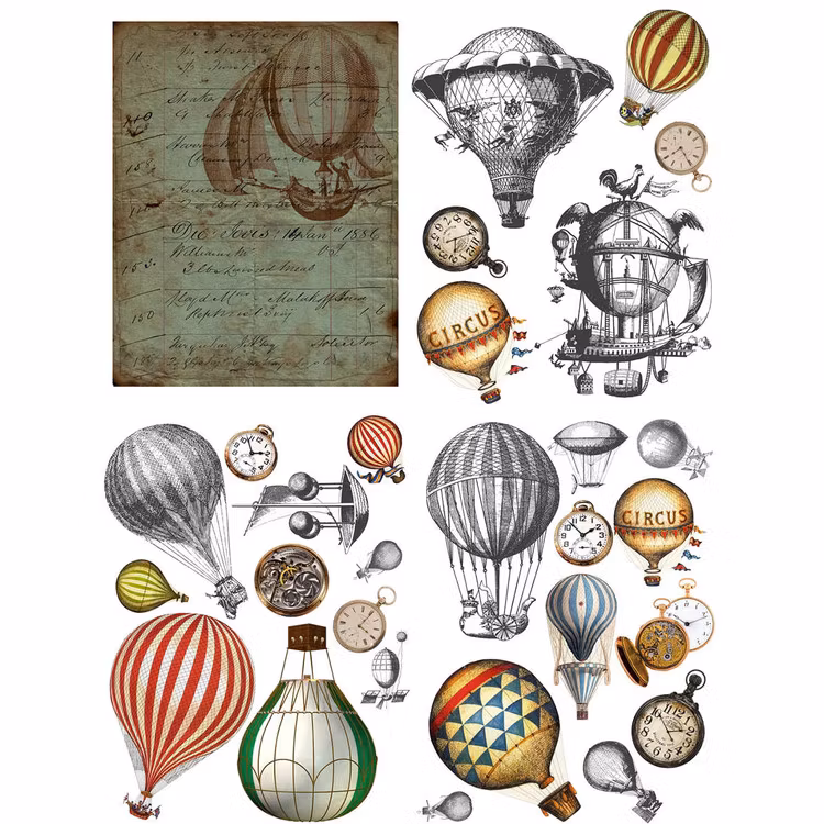 Sväva genom molnen med denna roliga och nyckfulla transfer. Med sina antika klockor och luftballonger ger Hot Air Balloons en härlig vintage- och steampunk-känsla till ditt projekt . Passar utmärkt tillsamman med Chalk Mineral Paint i nyanserna Barn Red, Coffee Bean, Kudzu, Rebel Yellow och Stormy Seas.