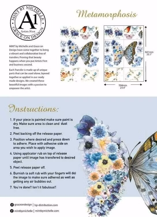 Varje transfer består av två ark som sitter ihop, det ena arket är en transparent film med det tryckta transfermotivet och det andra är ett matt skyddspapper som avlägsnas innan applicering.