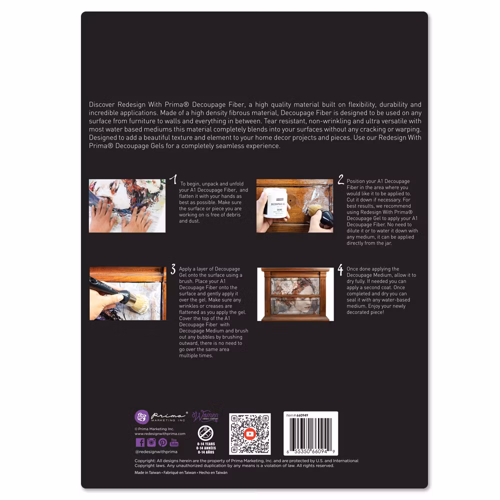 Re Design Decoupage Fiber Paper är ett budgetvänligt decoupagepapper som tillverkas genom en unik tryckprocess som ger ett flexibelt, hållbart och rivbeständigt fibröst material med hög densitet. Decoupage Fiber Paper är designat för att vara lätt att använda och ge ett skrynkelfritt resultat. Det kan användas på alla möjliga slags ytor, från möbler till väggar. Detta mångsidiga material är kompatibelt med de flesta vattenbaserade medier, det ”smälter” ihop med dina ytor utan att spricka och skrynkla.
