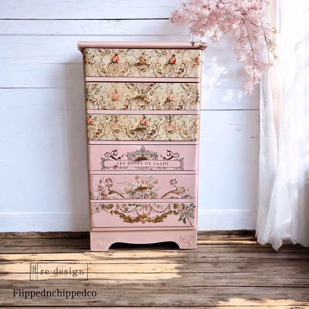 Re Design Decoupage Fiber Paper är ett budgetvänligt decoupagepapper som tillverkas genom en unik tryckprocess som ger ett flexibelt, hållbart och rivbeständigt fibröst material med hög densitet. Decoupage Fiber Paper är designat för att vara lätt att använda och ge ett skrynkelfritt resultat. Det kan användas på alla möjliga slags ytor, från möbler till väggar. Detta mångsidiga material är kompatibelt med de flesta vattenbaserade medier, det ”smälter” ihop med dina ytor utan att spricka och skrynkla.