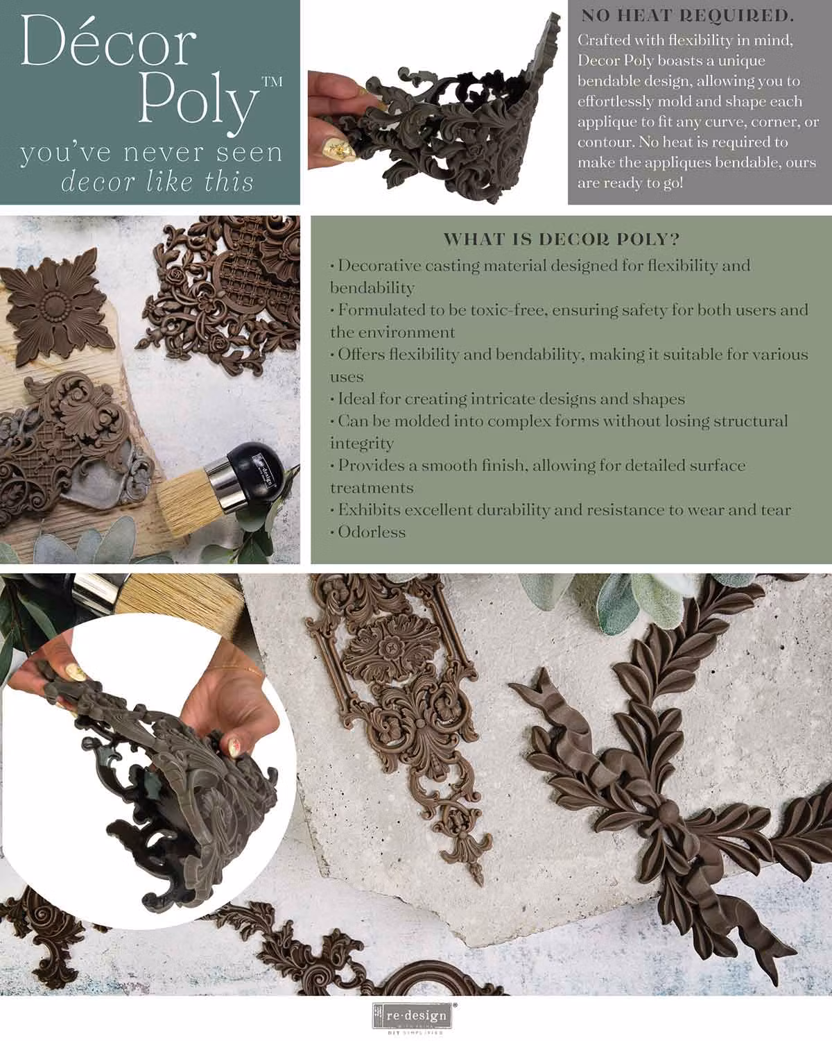 Décor Poly är de ultimata applikationerna för dig som vill slippa problemen som kan uppstå vid gjutning… eller om du helt enkelt inte har tid att tillverka dina egna ornament. Med Décor Poly™ kan du snabbt och komplikationsfritt ge alla dina projekt en tidlös elegans. Du sparar tid och behöver aldrig kompromissa med kvalitén på avgjutningarna - de är alltid perfekta.