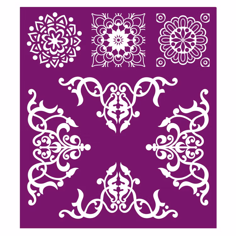 Med Silk Screen Stencils kan du åstadkomma mycket mer detaljerade och invecklade mönster och renare linjer än med vanliga schabloner. Det utskurna mönstret är inte "ihåligt" utan täckt med ett fin nät som främjar en jämn fördelning av färg och motverkar att färgen blöder utanför mönstret. Schabloner kan användas till dekormålning av väggar, golv, möbler samt annan inredning, men även till canvastavlor, scrapbooking och mixed media och textil.