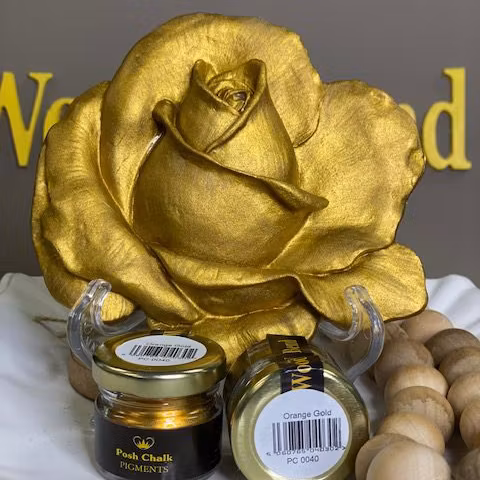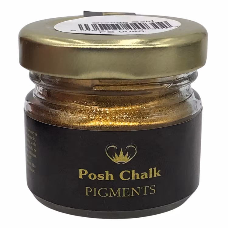 Posh Chalk Pigment är ett fint metalliskt pulver med härlig lyster som används till förgyllning m.m. Pigmentpulvret kan blandas med både vatten- och oljebaserade transparenta produkter som t.ex akrylmedium, lack ("liquid metal"), lasyr /glaze eller ett vax. Lite pigment räcker långt, så var inte för generös med din dosering.