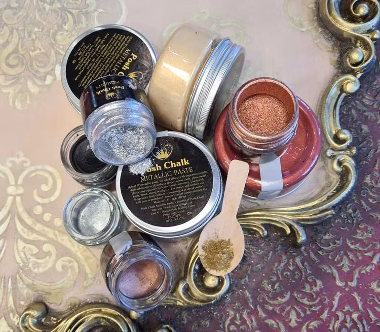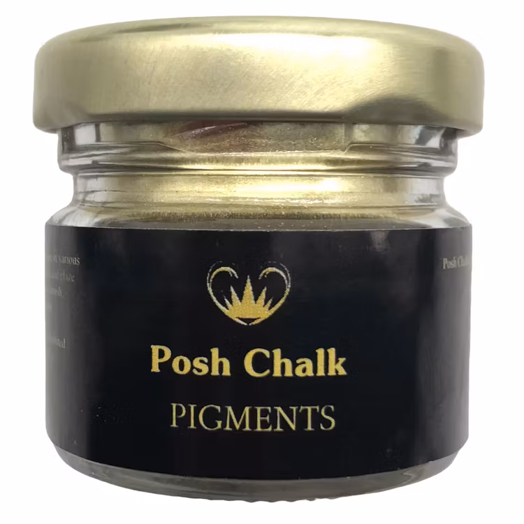 Posh Chalk Pigment är ett fint metalliskt pulver med härlig lyster som används till förgyllning m.m. Pigmentpulvret kan blandas med både vatten- och oljebaserade transparenta produkter som t.ex akrylmedium, lack ("liquid metal"), lasyr /glaze eller ett vax. Lite pigment räcker långt, så var inte för generös med din dosering.