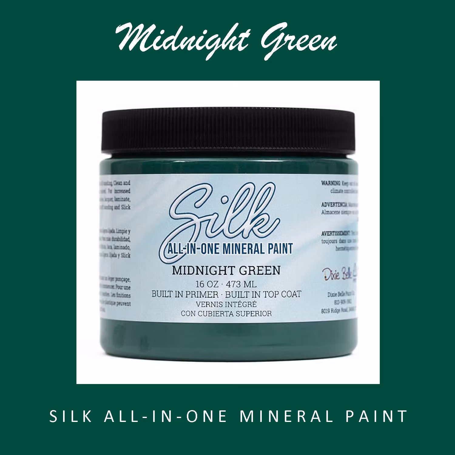 Dixie Belle Mineral Paint är en vattenburen akryl- och mineralfärg med inbyggd häftgrund, spärrgrund och topplack. SILK är dessutom UV-beständig och vattentät och kan användas utomhus. Den här fantastiska färgen kräver minimalt med grundarbete, är lättapplicerad och självutjämnande. Den ger ett exklusivt intryck med en silkeslen äggskalsfinish (halvmatt/satin).