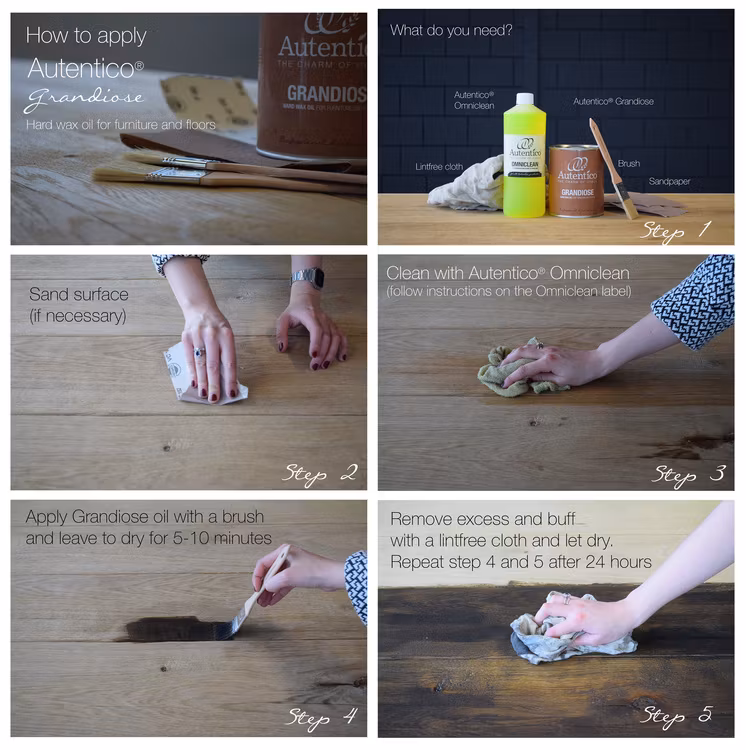 Autentico Grandiose hårdvaxolja lämnar en högpresterande skyddande beläggning på trärena ytor, ytor målade med kalk- och mineralfärger och andra porösa och sugande underlag. Grandiose innehåller lösningsmedel som hjälper oljorna att tränga djupt ner i underlaget. Den skyddar mot vatten, fukt, syror, alkohol, fukt, fett, fläckar, damm, smuts och dagligt bruksslitage. Autentico Grandiose finns som ofärgad; Natural (naturligt neutral) och i åtta färgade varianter; Light Grey, Sand, Clay, White, Soft White, Creamy White, Grey, Smoked.