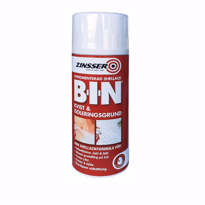 Zinsser BIN är en mycket effektiv shellackbaserad kvist- och isolergrund som kombinerar snabb torktid med en oöverträffad vidhäftning och bästa möjliga täckkraft. Innehåller äkta shellack och är lösningsmedelsburen. Zinsser B-I-N Aerosol är utmärkt för mindre föremål och möbler samt till punktbehandling på fläckar och kvistar som är extra envisa.