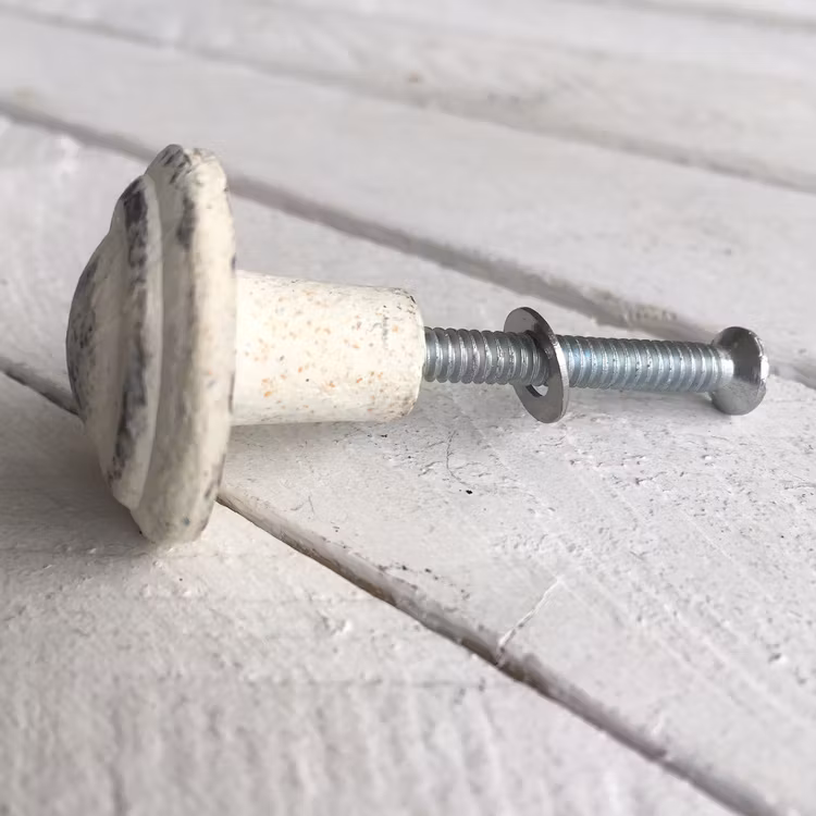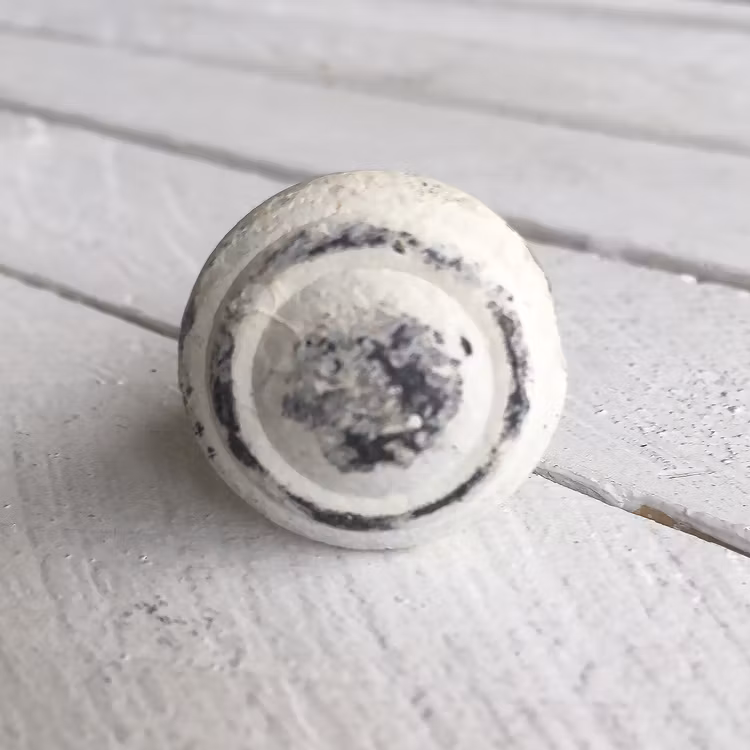 Liten metallknopp, vit med skavd färg. Alla är unika och ser lite olika nötta.