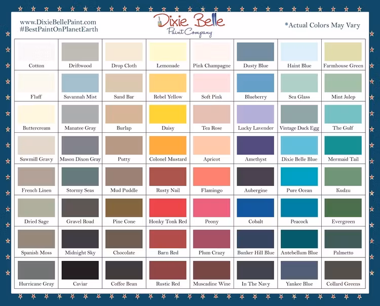 Innehåller alla färgkulörer från Dixie Belle Chalk Mineral Paint kollektionen.