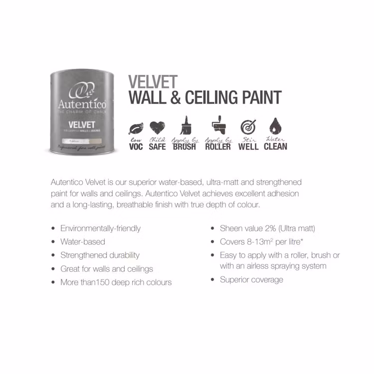 Autentico® Velvet är en vattenburen mineralfärg avsedd för målning av innerväggar och tak m.m. Velvet består av naturliga ingredienser och innehåller över 35% finmald kalksten (kalciumkarbonat). Den exklusiva finishen är ultramatt, sammetsmjuk och jämn (inte flammig som kalkfärgen Venice). Velvet är diffusionsöppen (andas) och tillåter fuktvandring. Ytan är mycket kalkhaltig, men fäller eller kritar inte och kan lätt övermålas med andra färger (ej att jämföras med traditionell limfärg). Velvet har god vidhäftning på de flesta ytor och kräver inte ett mineraliskt eller poröst/sugande underlag eller någon grundfärg.