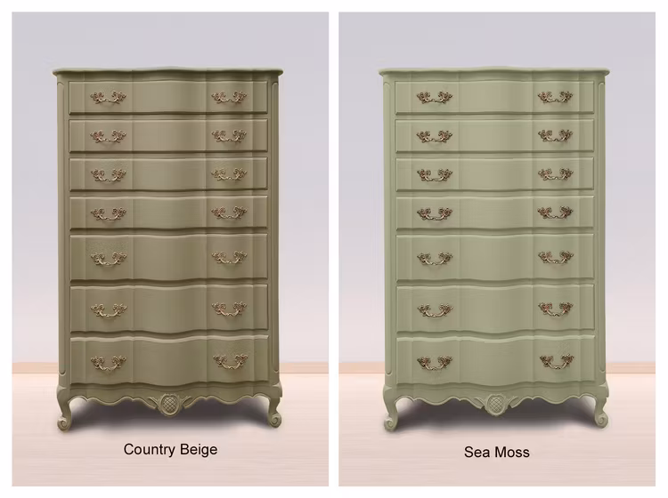 Country Beige ligger inte direkt nära någon av de andra gröna nyanserna i sortimentet. Det är en grön som innehåller mycket gult och brunt, en grönbeige nyans. Bredvid beiga och bruna kulörer ser man tydligt att den är mycket grön i nyansen.