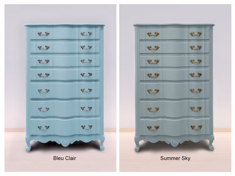 Bleu Clair är en ljuvlig lite ljusare klar blå nyans som i jämförelse med andra blå nyanser drar lite lätt åt det vattniga aquablå hållet, men har inte alls lika mycket grönt i sig Summer Sky eller nyanserna som ligger i kategorin Mint, Aqua och Duckegg. Summer Sky är mörkare och mer smutsig i nyansen än Bleu Clair.