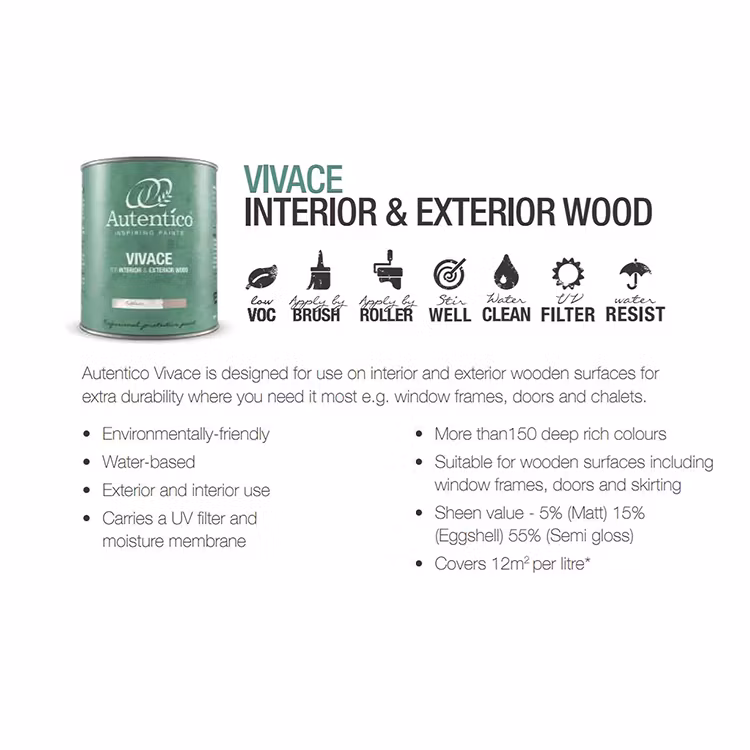 Vivace är Autenticos starkaste och mest motståndskraftiga färg. Det är en högpresterande professionell snickeri/lackfärg för målning av träytor och snickerier både inom- och utomhus.