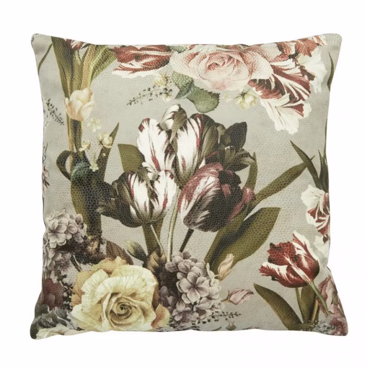 Beskrivning: Medium / kraftig sammet med präglad struktur (ett nedtryckt mönster, lite som ormskinn). Fin i kombination med t.ex. konstläder Buffalo. Vackert blomstermotiv i dova rosa och lila nyanser mot en gråbeige bakgrund som drar åt grönt. Den präglade strukturen och inblandningen av frodiga tulpaner och blad tar udden av det romantiska och bidrar till ett lite tuffare intryck.